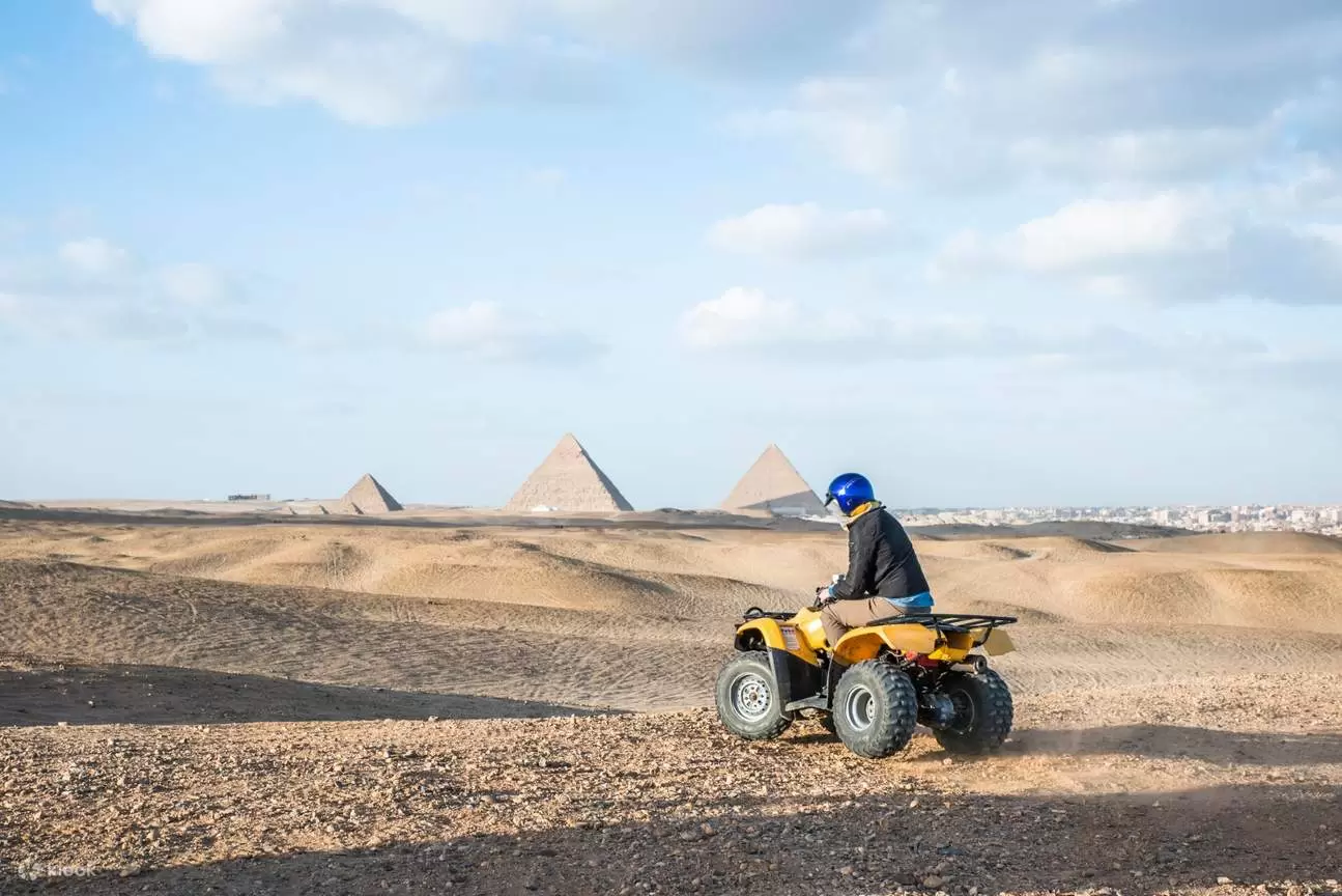 Our representative will pick you up from your hotel in Cairo or Giza to start your Cairo day tours . Then we will transfer you to the Giza Plateau via an a/c car. We will take you to a Quad Center, where you’ll learn the fundamentals of safe quad biking and opt for a few practice run before starting your bike and heading to the sand. Quad biking is the best way to drive past the swarmed pyramid region and experience the desert, it's the best experience in Egypt day tours as expert guides lead you through dunes and valleys All the pyramids are located in the Libyan Desert part of the Sahara, the biggest desert on the earth. an exhilarating addition to our Egypt tours and Cairo day tours. Experience the breathtaking beauty of the desert landscape surrounding the iconic pyramids of Giza .